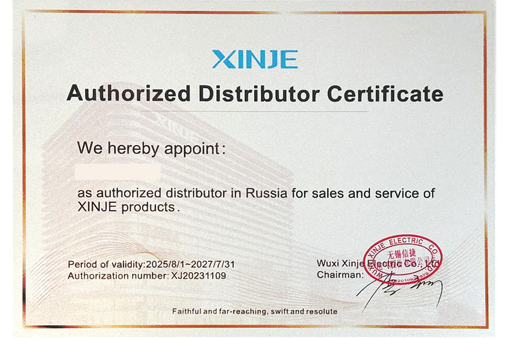 Наша компания является официальным дистрибьютером Xinje в России. Данный сертификат подтверждает нашу способность предоставлять высококачественное оборудование и сервисное обслуживание в сфере индустриальной автоматизации, соответствуя высоким стандартам производителя. Мы гордимся нашим партнерством и стремимся обеспечить клиентов надежными решениями для их промышленных потребностей.